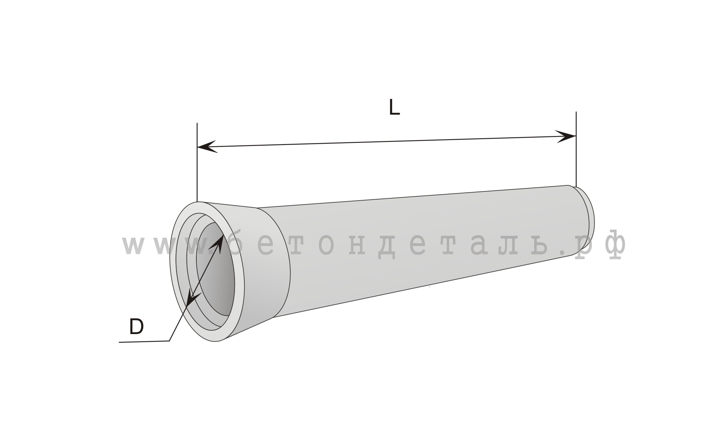 Длина стандартна - без раструба бетонная труба составляет 5 метров. Диметр прохода труб колеблется от 500 до 1600 мм.
