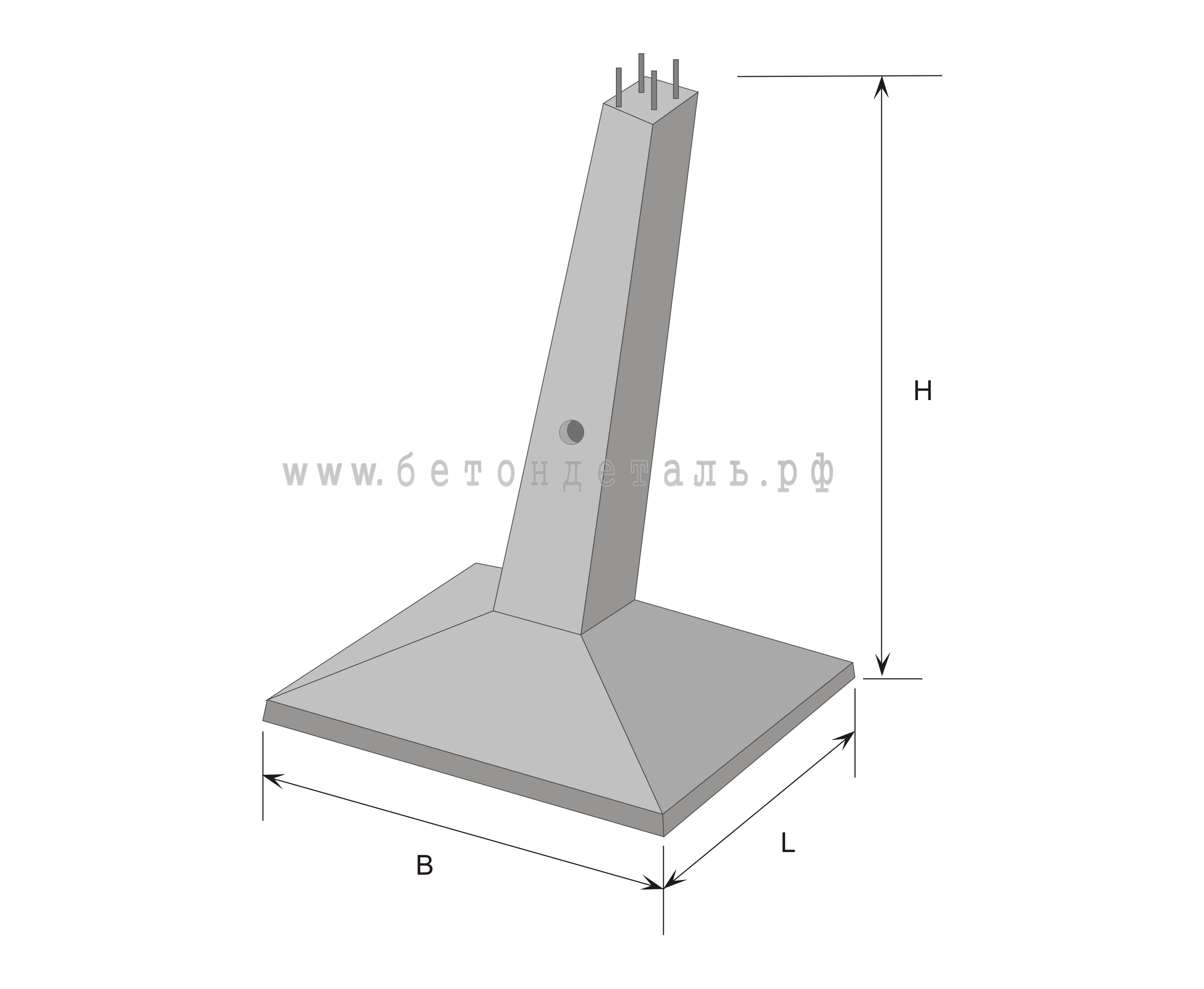 Фундамент грибовидный подножник Ф 4-05 представляет собой монолитную конструкцию, состоящую из пирамидальной железобетонной плиты и расположенной на ней наклонной стойки, в которую встроены закладные детали, предназначенные для крепления изделия к опоре.